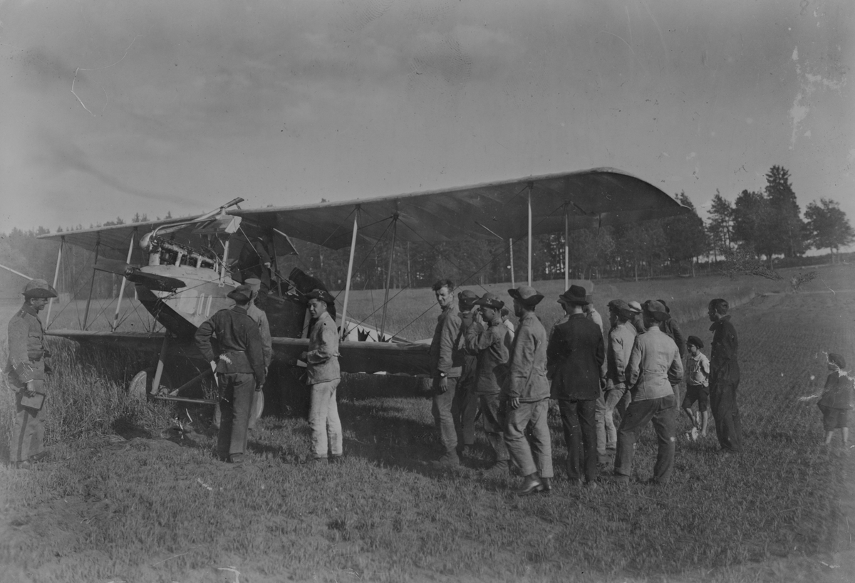 Flygplan Albatros BIIa på ett fält. Militärer och folksamling omkring flygplanet.