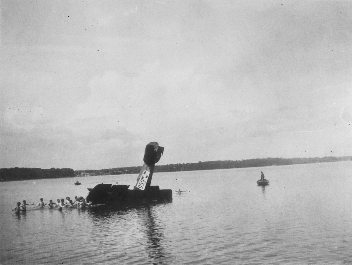 Flygplan J 1 Phönix D.II, Phönixjagaren nummer 959 har landat på nosen på vattenytan. Omkring 15 män står i vattnet och arbetar med flygplanet .