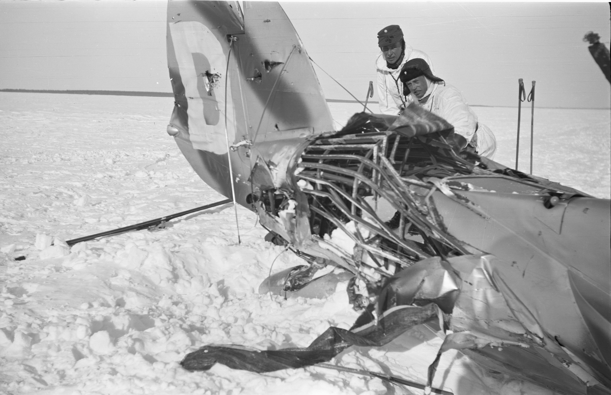Vrak efter havererat flygplan J 8 Gloster Gladiator nr 274, märkt gul D vid Svenska frivilligkåren i Finland, F 19. Två män vid flygplanets stjärtparti.