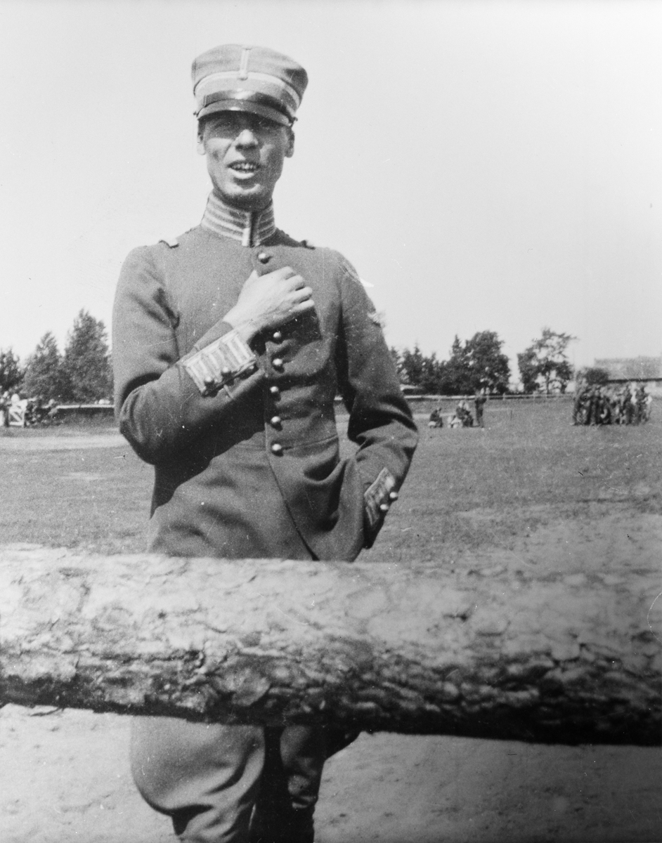 Närbild av löjtnant Ernst "Pat" O'Konor ståendes på ett fält.