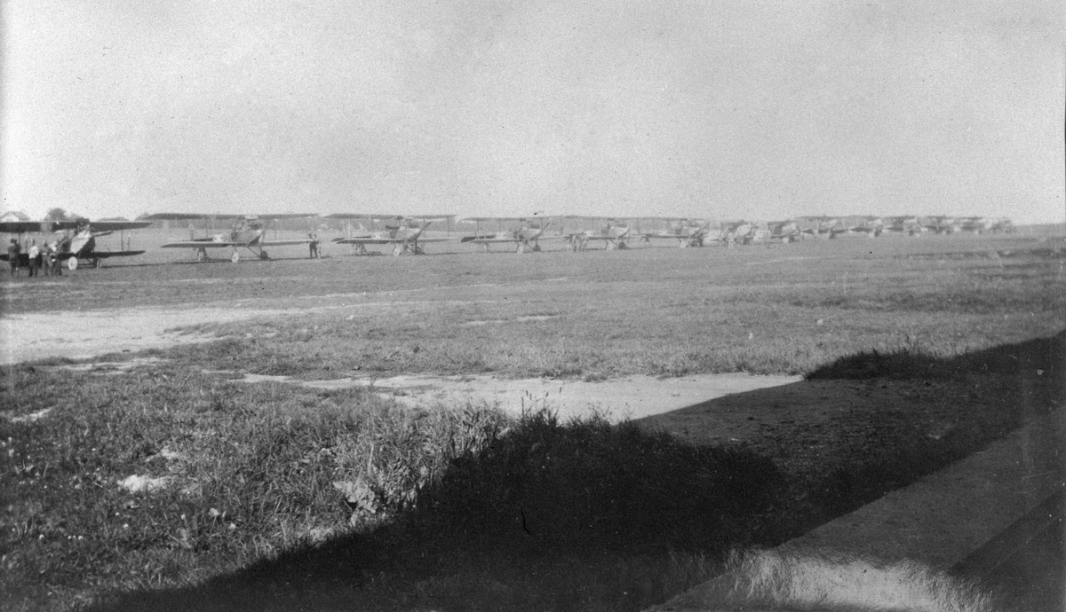 Svenska militärflygplan uppställda på linje på ett flygfält, 1920-tal. Bland annat flygplan Phönix Dront och flygplan Albatros..
