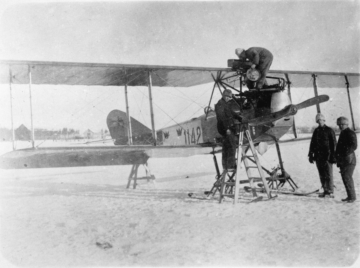 Påfyllning av bränsle på flygplan FVM Albatros 160 nummer 1142 på skidor, vintertid omkring 1922-1926. Fyra militärer i arbete. På Flygkompaniet på Malmen.