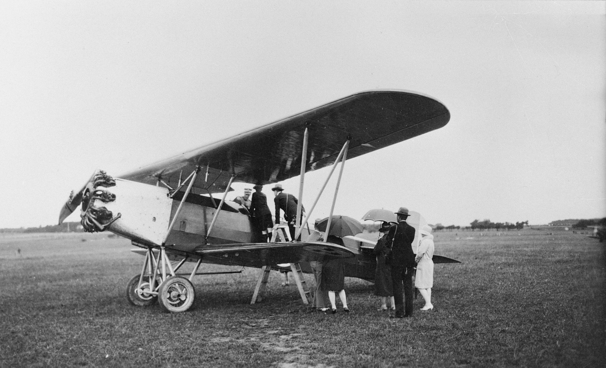 Visning av flygplan S 6, Fokker C.V. på ett flygfält. En grupp civila står vid planet. Omkring 1930.