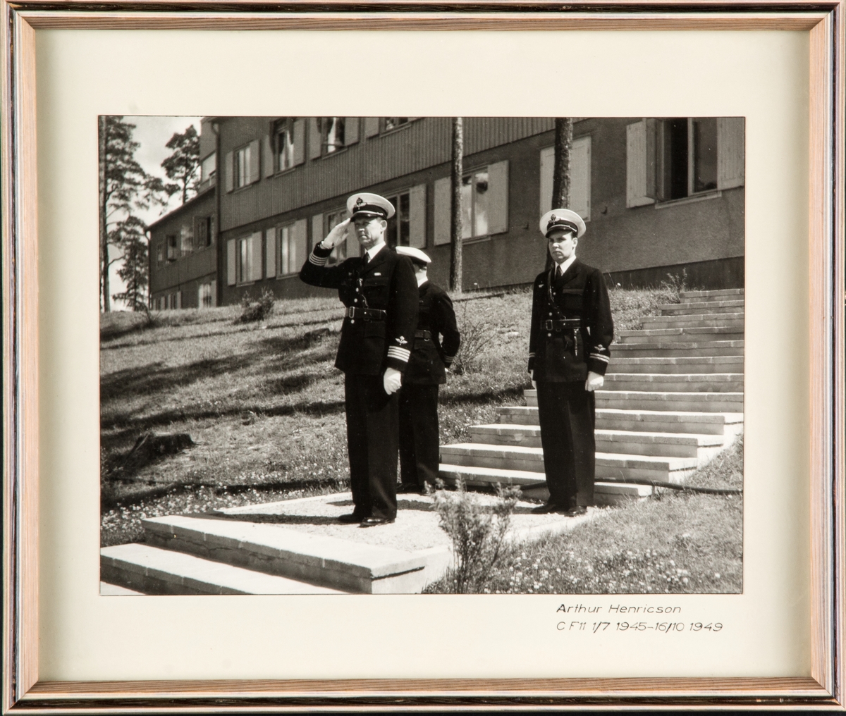 Porträttfotografi av Arthur Henricson, chef för Södermanlands flygflottilj. Honnörhälsning på en trappa. I bakgrunden står två militärer. Inramat foto.