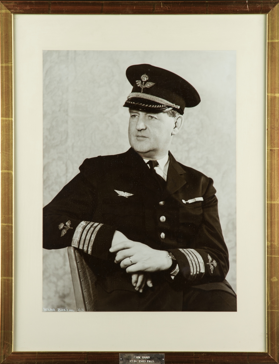 Porträttfotografi av Erik Raab, chef för F 18 Södertörns flygflottilj 1949-1963. Inramat foto.