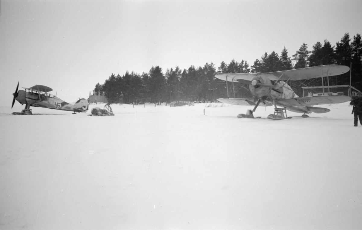 Två stycken flygplan Gloster Gladiator på ett flygfält vid F 19, Svenska frivilligkåren i Finland.