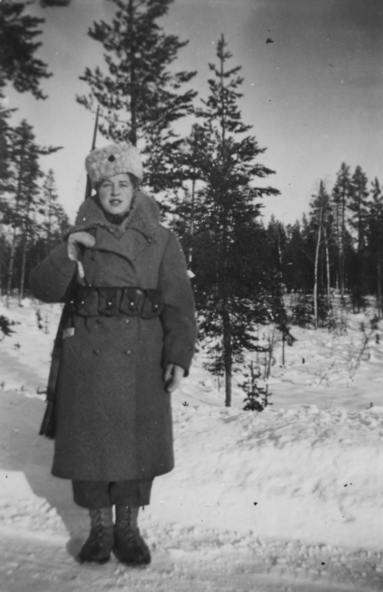Porträtt av luftbevakare Karin Nordberg i uniform och med gevär, vintern 1942. Utomhus vid luftbevakningsförläggningen tillhörande 91:a ls-kompaniet, Tellejåkk, Kåbdalis under beredskapsåren.