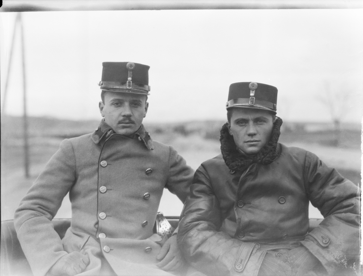 Porträttfoto av två militärer från Österrike-Ungern sittandes i baksits på en bil under första världskriget.