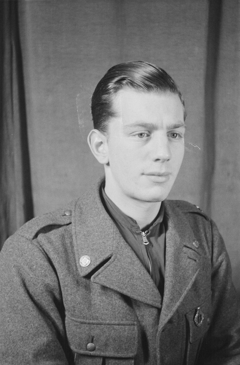 Porträttfoto av soldat Rune Ewald Eriksson (nummer 937), mekaniker vid F 19, Svenska frivilligkåren i Finland under finska vinterkriget, 1940.