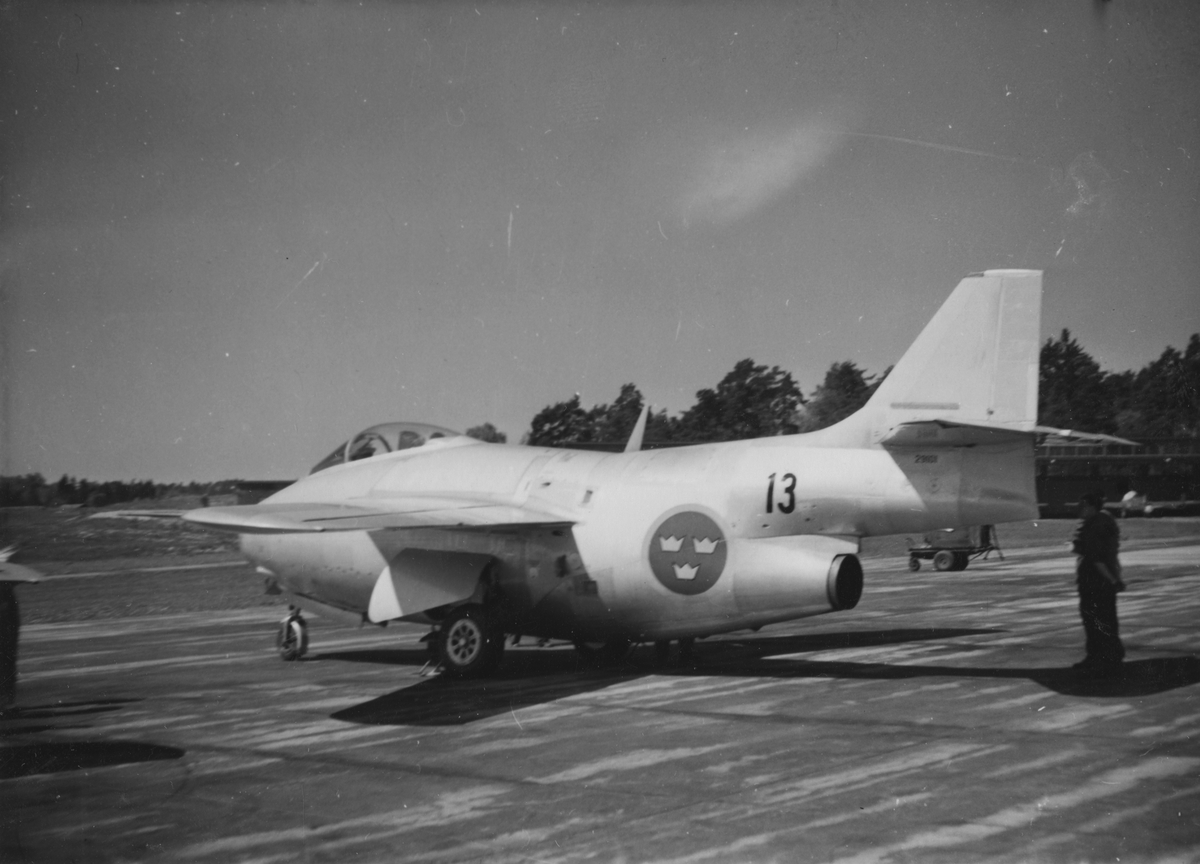 Flygplan J 29 Tunnan på flygfält på F 8 Barkarby. Flygplanet tillhörande F 13 Bråvalla flygflottilj.