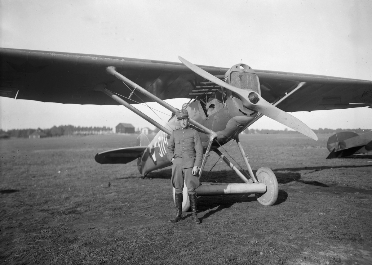 Porträtt av militäre flygföraren Karl Gunnar "Kåge" Lindner framför flygplan FVM J 23 på Malmen.