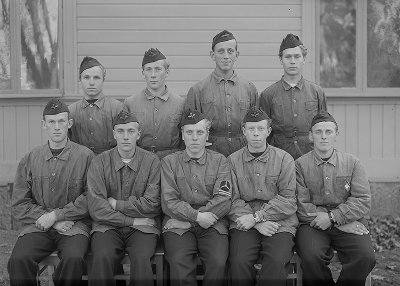 Elever vid furirskolan för flygplansmekaniker på F 3 Östgöta flygflottilj, 1945-1946. Del av klass, nio stycken elever. Grupporträtt framför byggnad.
