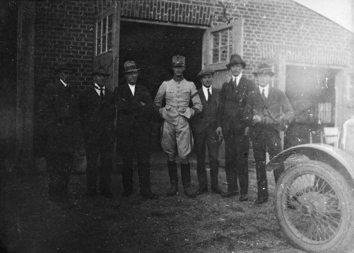 Gruppbild framför garaget på Flygkompaniet tygverkstäder på Malmen, omkring 1920-1925. En officer och sex civilklädda män.