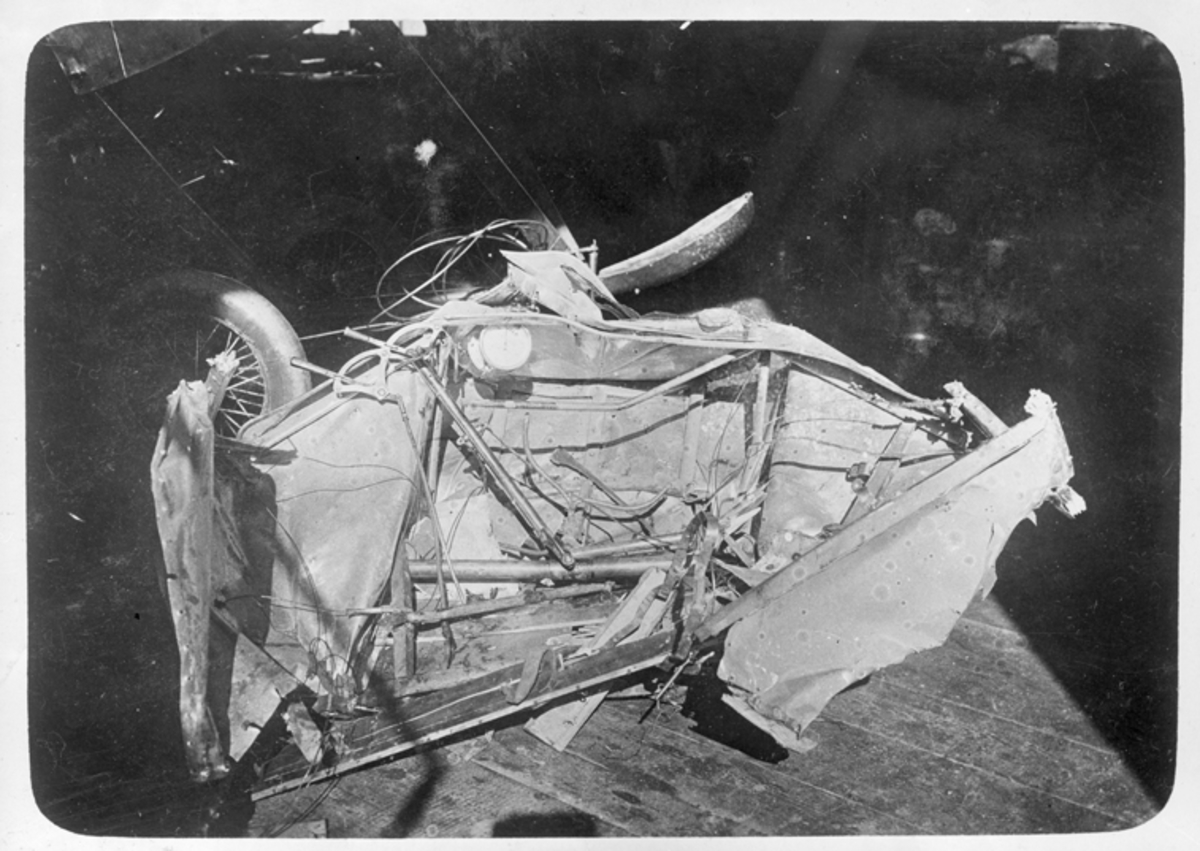 Haveri. Resterna av havererat flygplan Farman HF 22 i en hangar på Malmen.