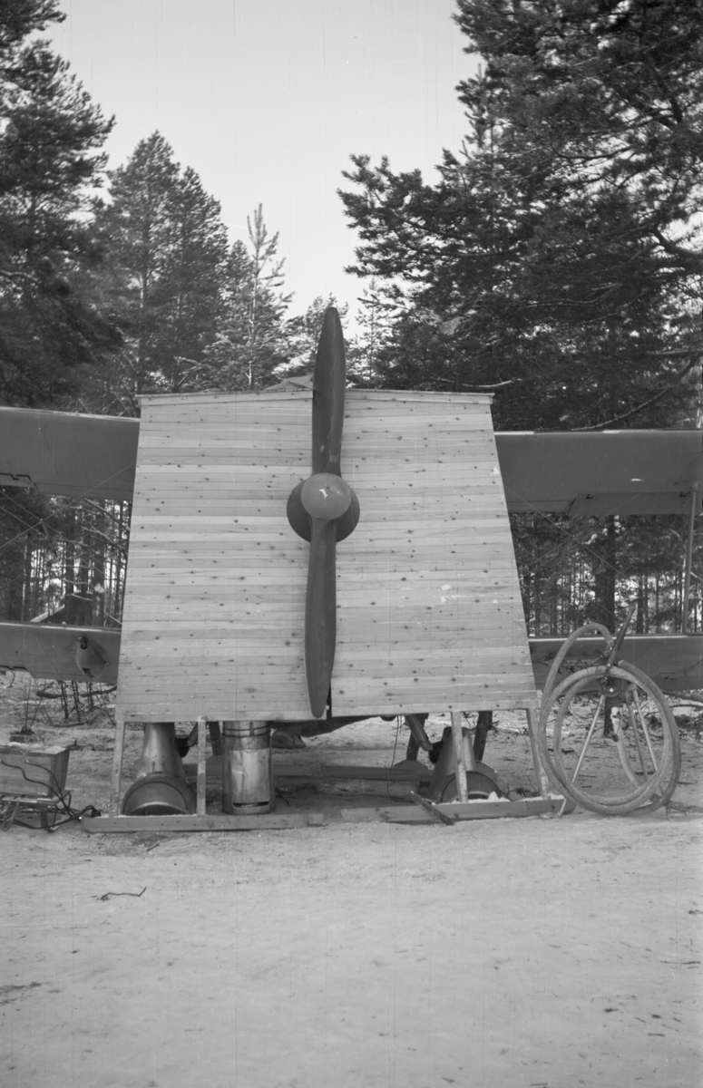 Flygplan Gloster Gladiator står i skyddshus vid F 19, Svenska frivilligkåren i Finland.