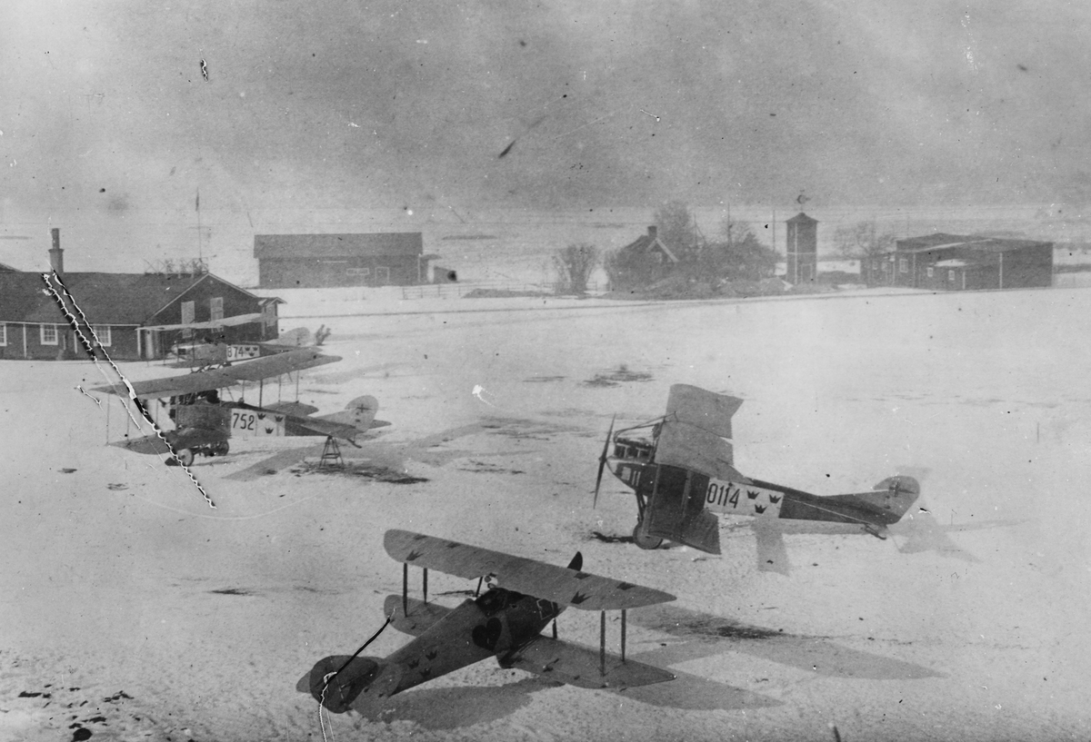 Översikt av tre flygplan Albatros B IIa märkt nummer 752, 874 och 0114 samt Tummeliten 'Hjärter ess' tillhörande Flygkompaniet, vid verkstadsområdet för Flygkompaniet, vintertid.