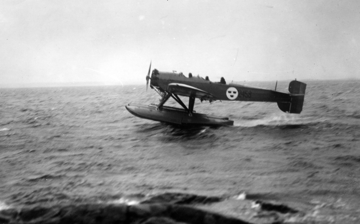 Flygplan S 5A, Heinkel He 5 Hansa nummer 2458 kör på vatten. Vy från sidan. 1930-tal.