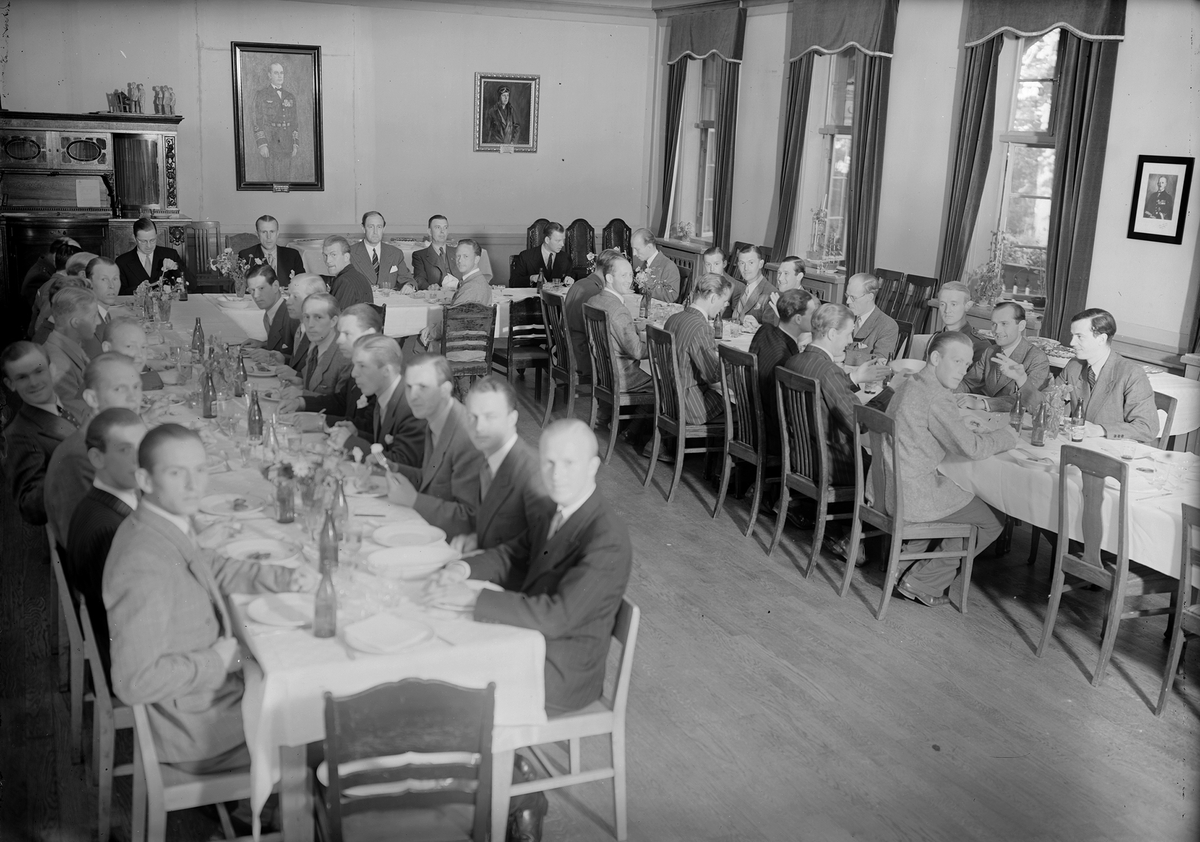 Sista middagen på gamla officersmässen på F 3 Östgöta flygflottilj, 1943. Grupporträtt av män sittandes till bords.