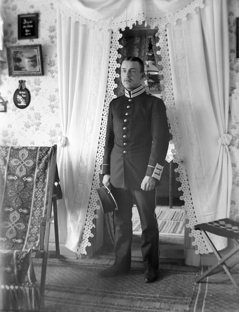 Porträtt av en armésoldat från I 4 eller I 5 regemente som står vid en dörr inomhus