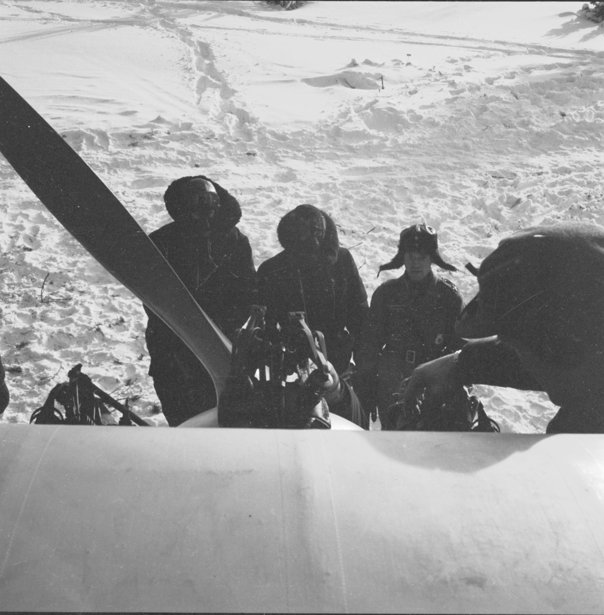 Flygare och mekaniker vid F 19, Svenska frivilligkåren i Finland. Samling vid flygplansvinge. Vy uppifrån.