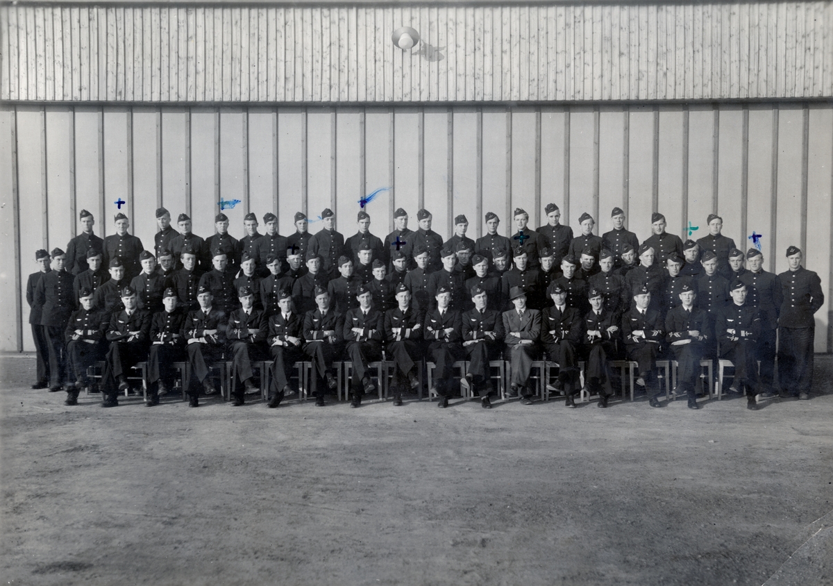 Porträttfotografi av elever och lärare vid reservflygskolan i Eslöv, 1941.