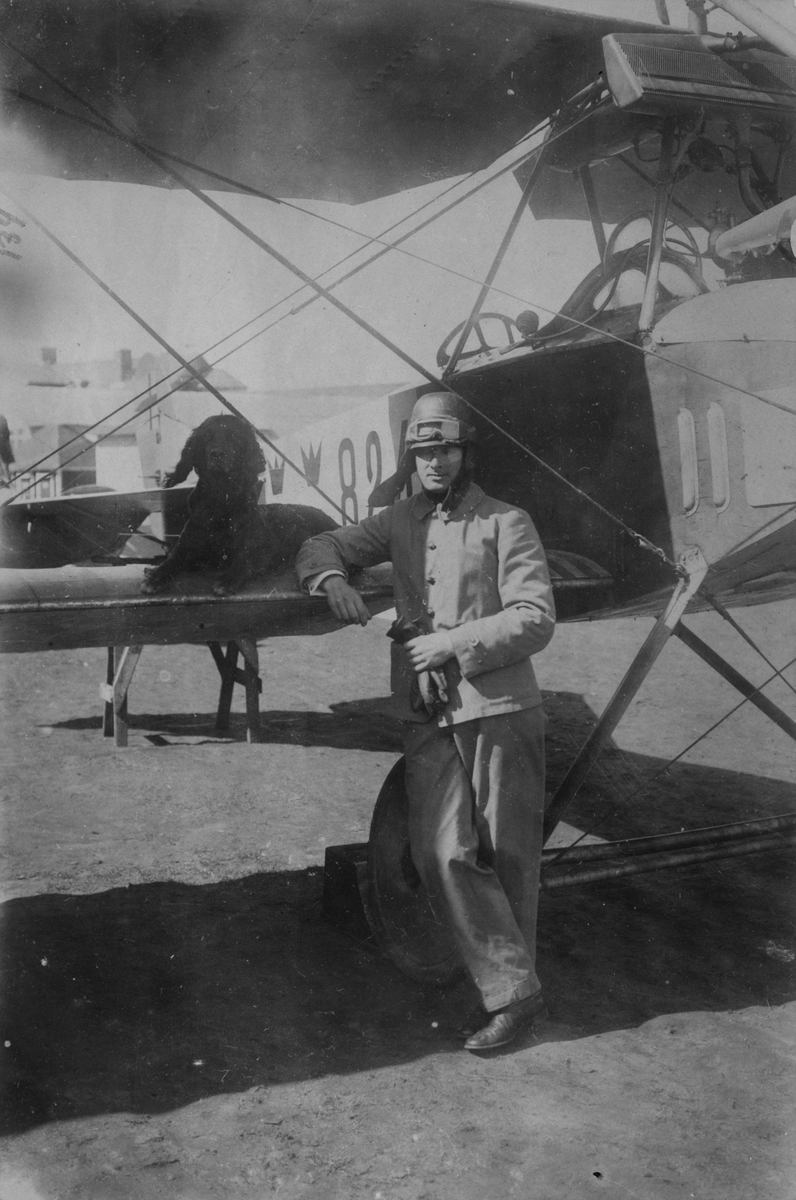 Porträtt. Flygförare och hund. En militär flygförare står fram flygplan Albatros SAF 3 märkt nummer 824 på Flygkompaniet på Malmen. På flygplansvingen sitter en hund.