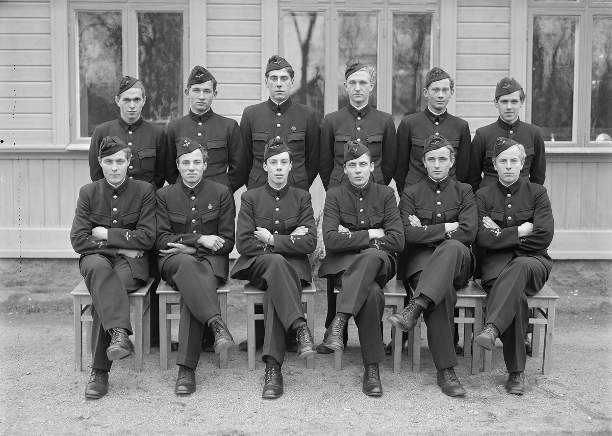 Titel: Elever vid korpralskolan på F 3 Östgöta flygflottilj, 1943-1944. Del av grupp. 12 stycken elever. Grupporträtt framför byggnad.