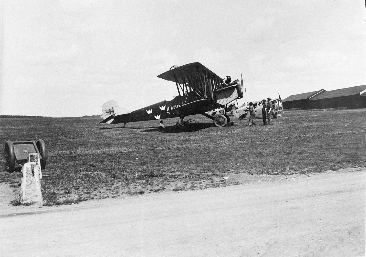 Arbete med uppställt flygplan B 1, Fiat BR, nr 4400, framför Flygkompaniets F-hangar på Malmen omkring 1924-1926. Sex personer vid flygplanet. Tre flygplan FVM Tummeliten i bakgrunden.