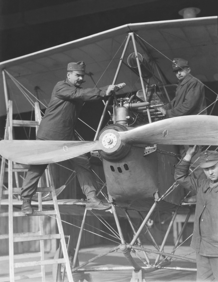 Två mekaniker i arbete med motorn på flygplan Lohner B i hangar i Österrike-Ungern. En tredje mekaniker står och håller fast flygplanets propeller.
