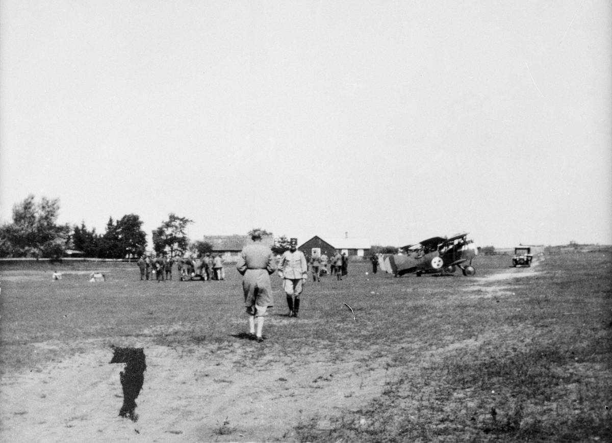 Militärer och flygplan J 1 uppställda på flygfältet på Malmen, omkring 1930. I mitten syns förvaltare Gustav Guander.