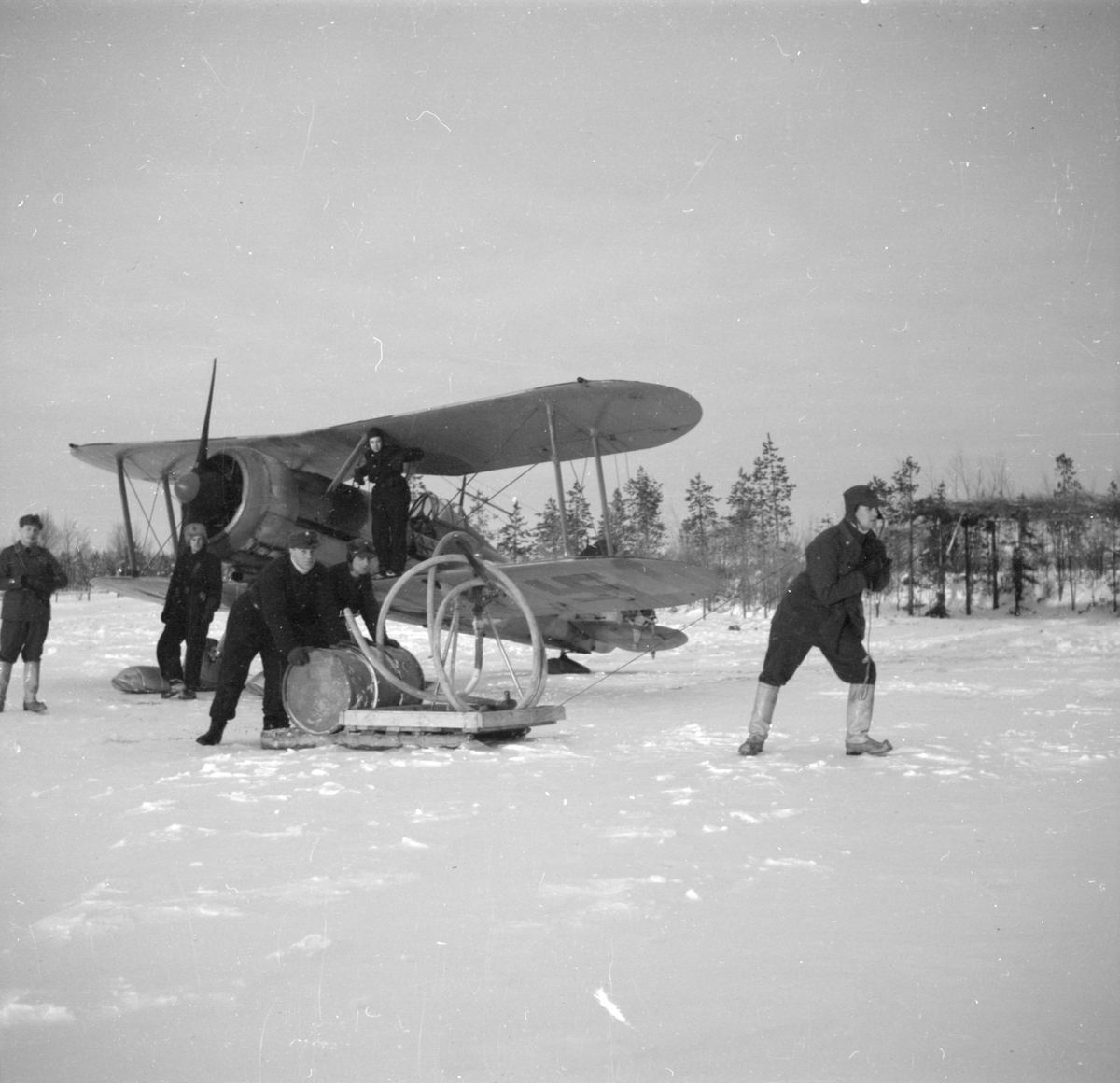 Tankning av flygplan Gloster Gladiator märkt gul G vid F 19 Ulriksbasen i Uleåborg, Svenska frivilligkåren i Finland. Sex flygmekaniker i arbete.