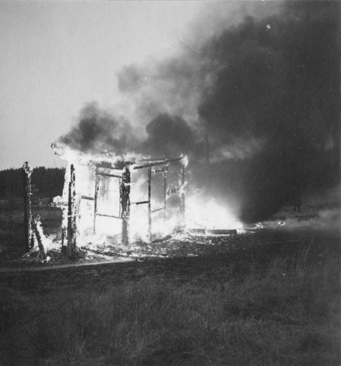 Brandövning, eldsläckning på F 2 Roslagens flygflottilj. Övertänt uthus.