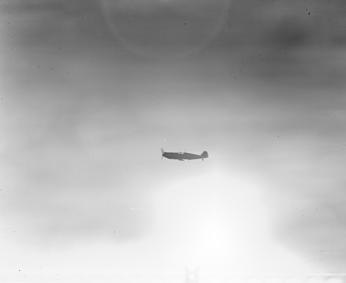 Flygfotografi av tyskt flygplan Messerschmitt BF 109E i luften över hav.