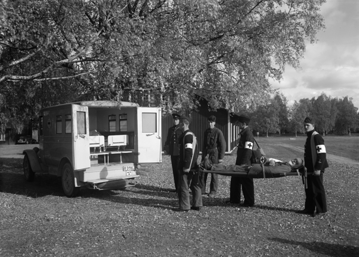Sjukvårdsövning. Sjukvårdare flyttar man med bår till ambulans.