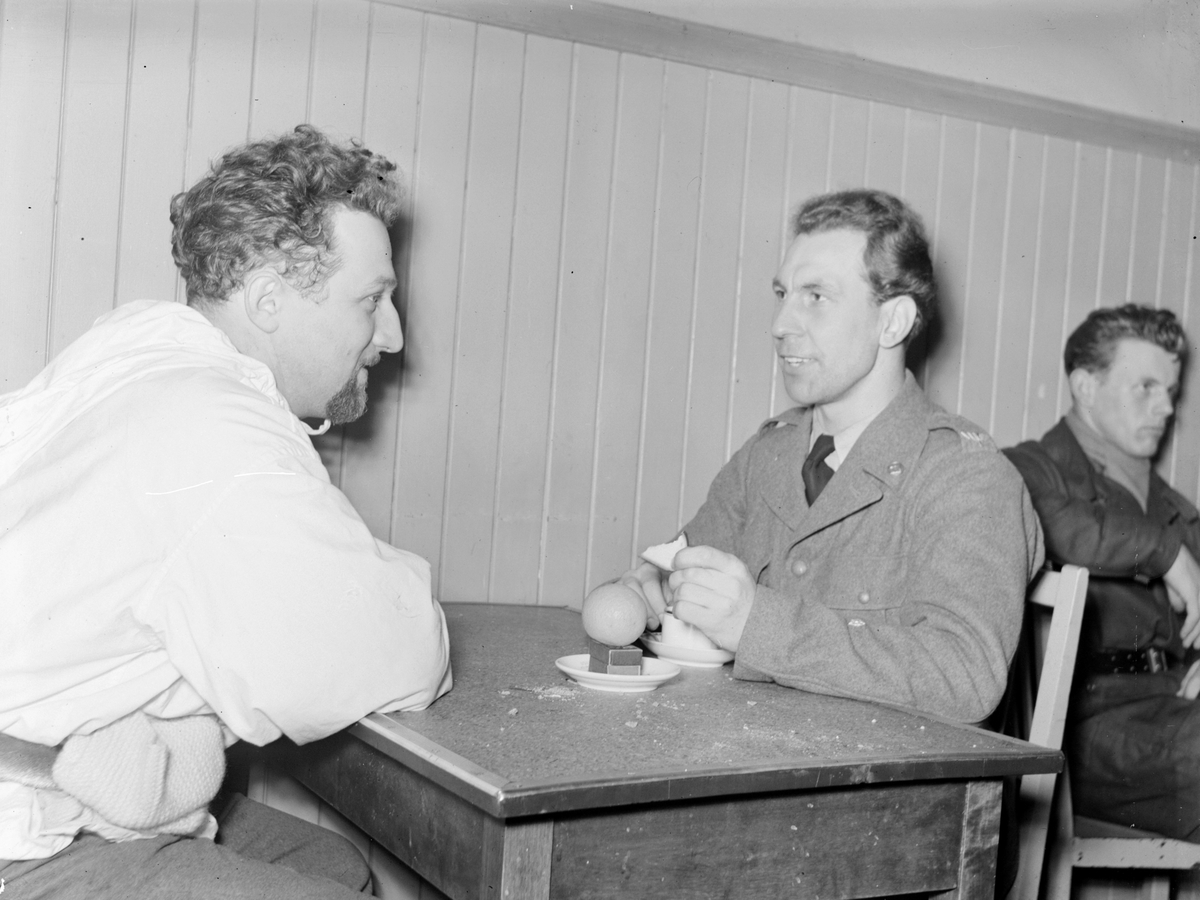 Två militärer ur F 19, Svenska frivilligkåren i Finland samtalar vid ett fikabord.