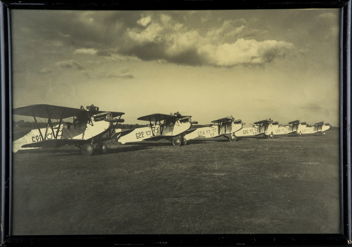 Sex stycken flygplan A 1, Phönix C.I Dront E.2 står på linje på ett flygfält. Monterat foto.