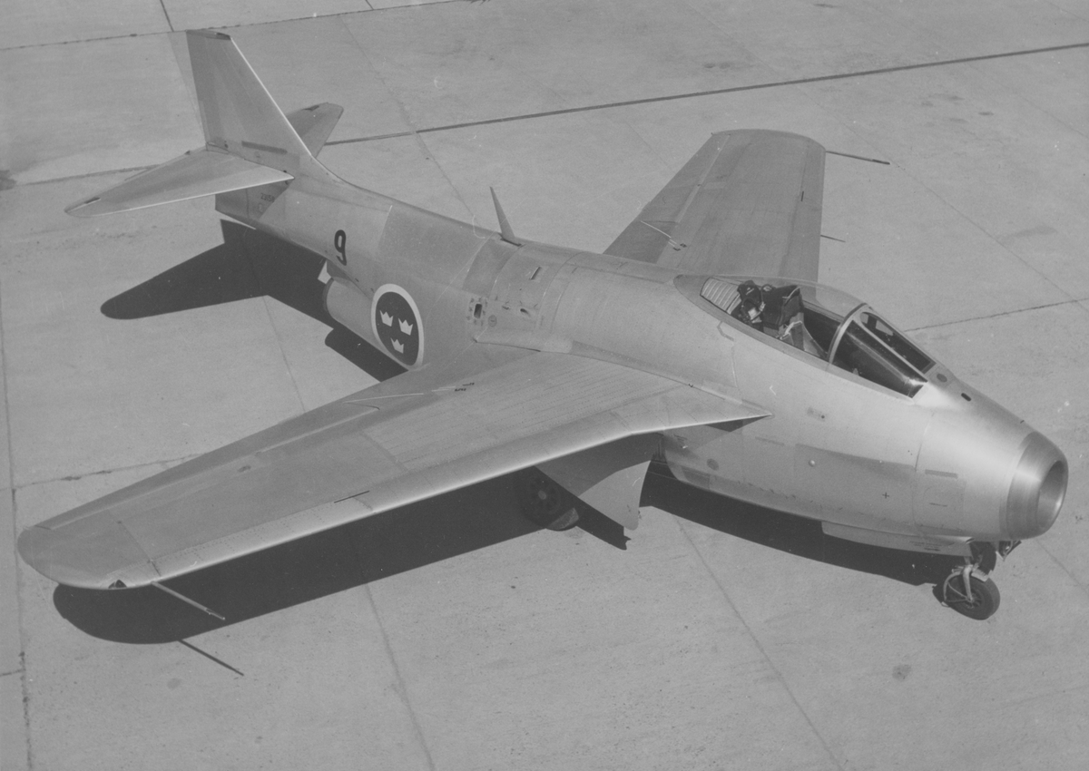 Flygplan J 29 Tunnan nr 29 158 tillhörande F 9 Göta flygflottilj står på flygbana. Vy ovanifrån.