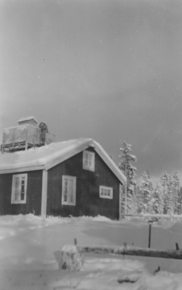 Exteriör av militärförläggningen för 91:a ls-kompaniet för luftbevakning i Tellejåkk, Kåbdalis under beredskapen, 1942. Ett hus med luftbevakningstorn på taket.