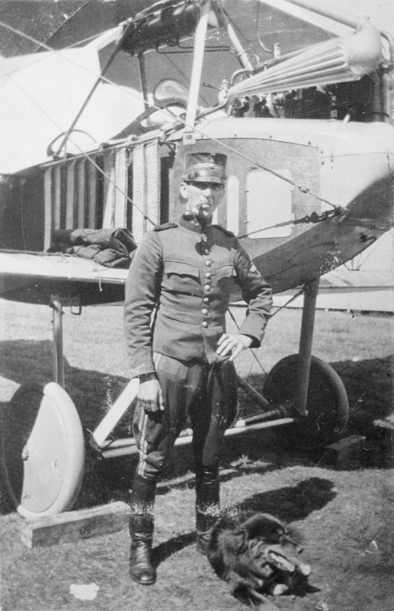 Flygföraren, löjtnant Elis Nordqvist, med hund framför flygplan omkring 1920.