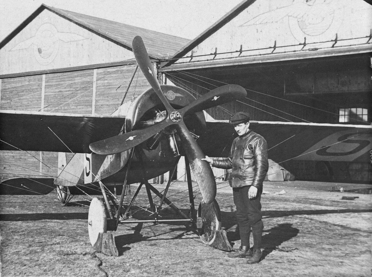 En man står vid ett flygplan Thulin B utanför Thulins flygskola omkring 1915-1918.