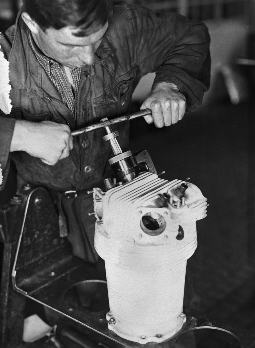 Arbete med ventilsäte; brotschning, på cylinder till en flygmotor på Centrala flygverkstaden Malmslätt, 1930-tal.