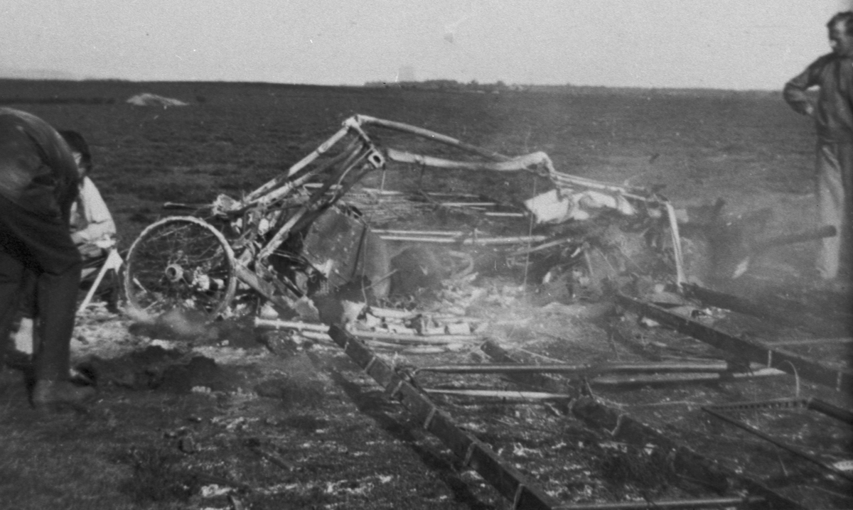 Två män inspekterar vraket efter ett havererat flygplan Thulin A vid Ljungbyhed, ca 1915-1918.