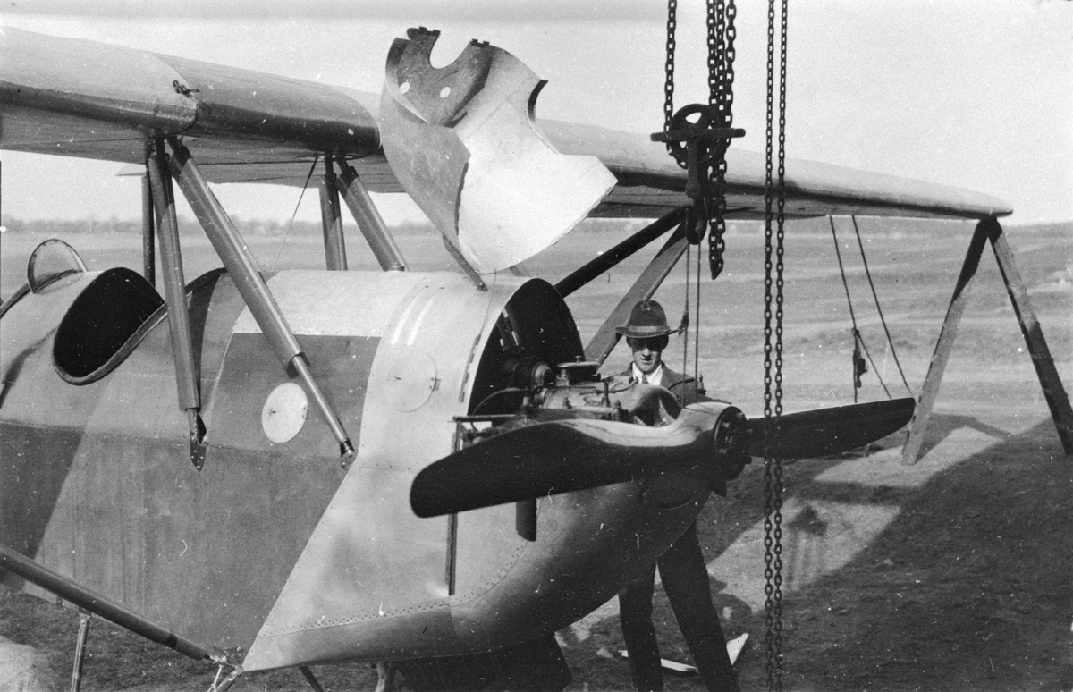 Närbild av nos på civilt flygplan Petterson S-81 (Planet Pettson) under slutmontering, 1924. På plats vid F-hangarerna på Malmen. En man står vid bredvid. Planet konstruerades och byggdes av ingenjör Hugo Petterson (senare Bertler). Planet registrerades år 1932 som SE-ADD.