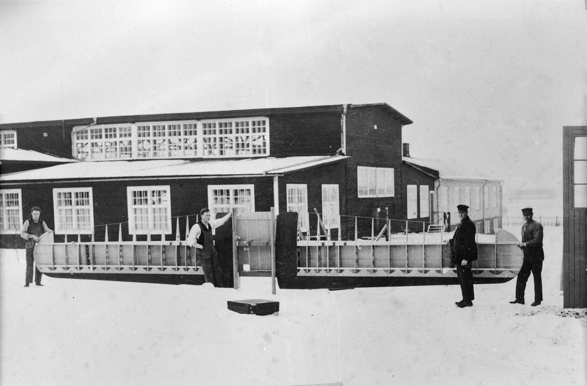 En oklädd vinge till flygplan Fokker på väg från snickeriet till verkstad byggnad 24 för dukklädsel på Centrala flygverkstäderna Malmslätt. Vintertid, tidigt 1930-tal. Fyra män vid vingen.