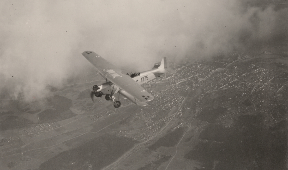 Flygplan S 6 Fokker C.VE märkt nummer 1375 i luften över landskap, cirka 1932-1935. Flygbild.