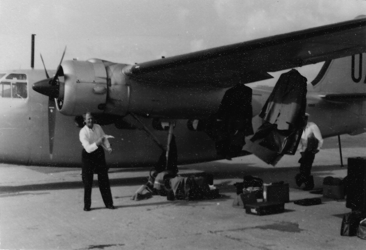 Svenska militära flygare klär om sig under vingen på flygplan TP 83 nummer 07 från F 17 Kallinge. Mellanlandning under flygning till Turkiet, 1955.