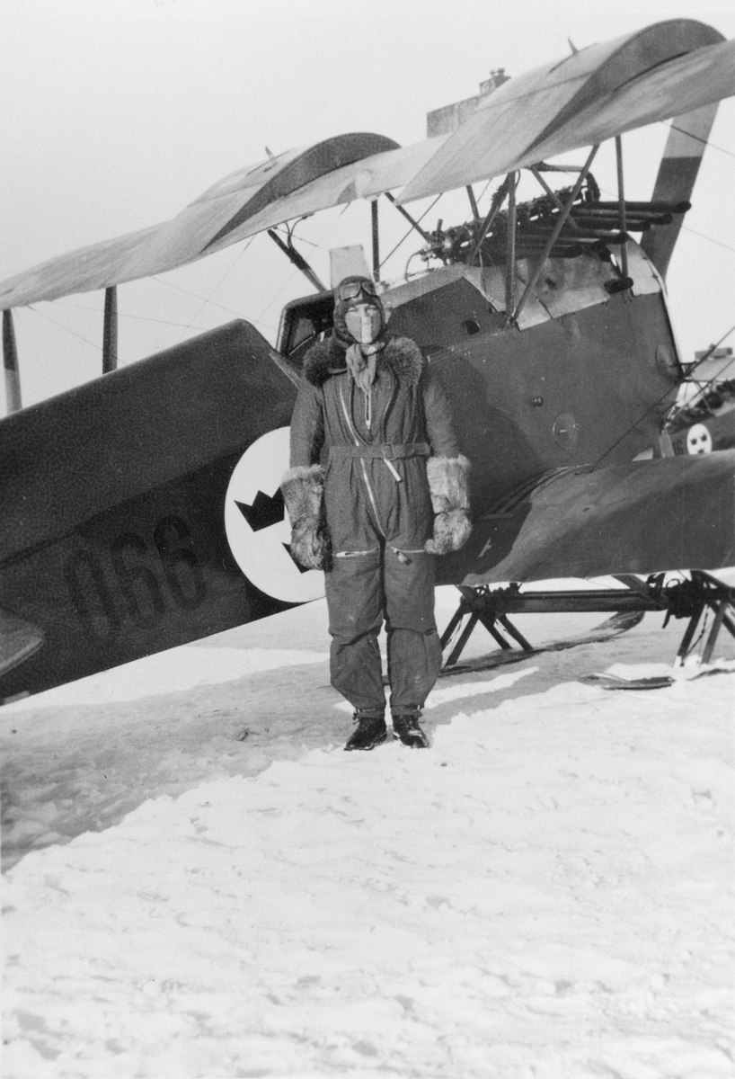 Militär flygförare iklädd vinterklädsel står framför flygplan Phönix D. III nummer 066 med vingtankar. Omkring 1926-1927.