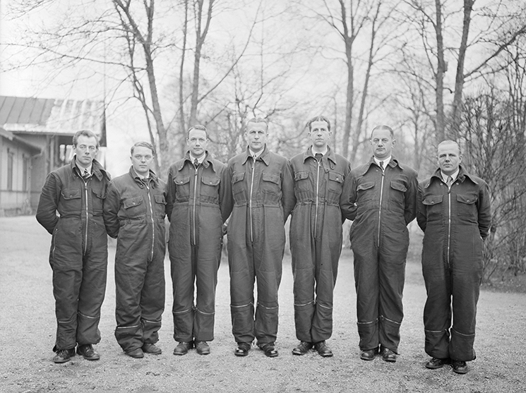 Flygare som flugit hem flygplan Caproni från Italien till F 3 Östgöta flygflottilj, 1940. Grupporträtt. Furir Helmer Larsson, sergeant Forsberg, kapten Nordström, kapten Loriens, kapten Sörlander, löjtant Bosson samt verkmästare Holmberg.