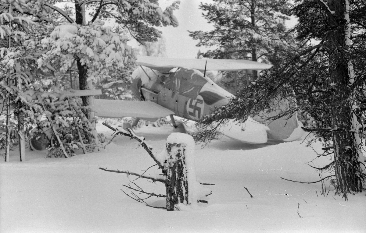 Flygplan Gloster Gladiator tillhörande F 19, Svenska frivilligkåren i Finland, står i fält, inför reparation. Vy bakifrån.