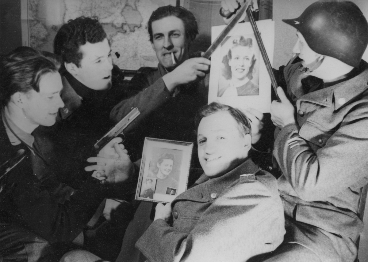 Samkväm på förläggning vid Svenska frivilligkåren i Finland, F 19. Gruppfoto av fem militärer som håller porträttfoton av kvinnor, pistoler och svärd. Längst till vänster sitter Matti Sundsten.
